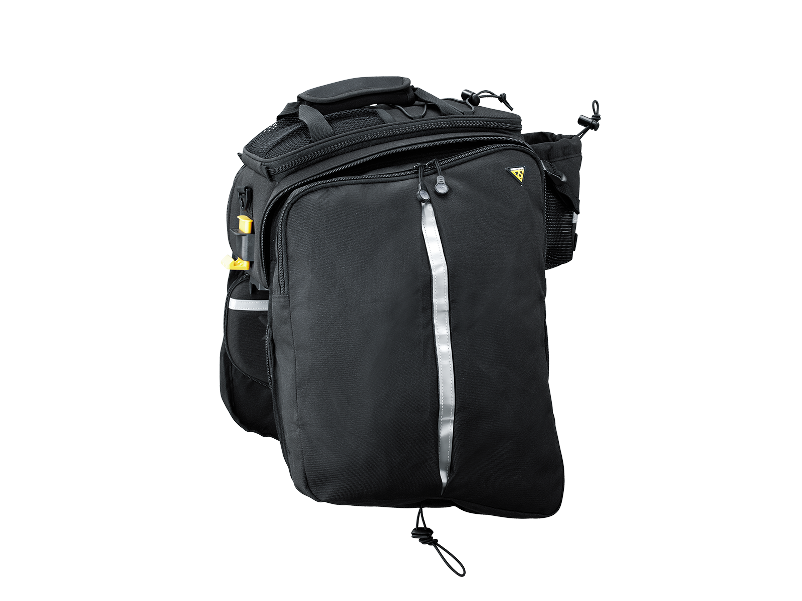 Large capacity MTX TrunkBag containing one main divided compartment with two expandable pannier side panels and rear water bottle holder. Our unique construction process provides rigidity and water repellency. Compatible with all MTX QuickTrack® racks with attached side frames. MTX Dual Side Frames are required when using side panniers on MTX BeamRacks.